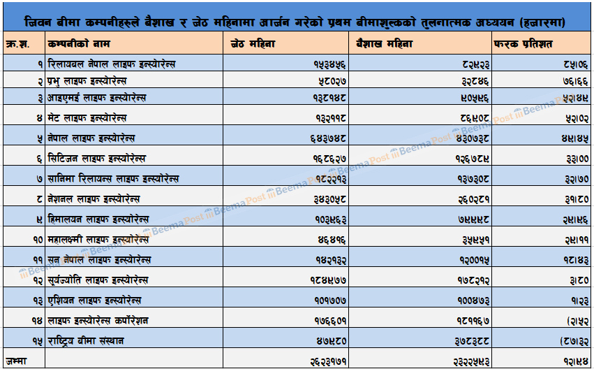 बैशाखको तुलनामा जीवन बीमा कम्पनीहरुको प्रथम बीमा शुल्क आम्दानी १३ प्रतिशतले बढ्यो, अर्थतन्त्रमा सुधार भएको अनुमान
