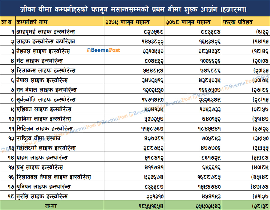 फागुन मसान्तसम्ममा जीवन बीमा कम्पनीहरुको प्रथम बीमा शुल्क आर्जन १८ अर्बमाथि, कुनको कति ?