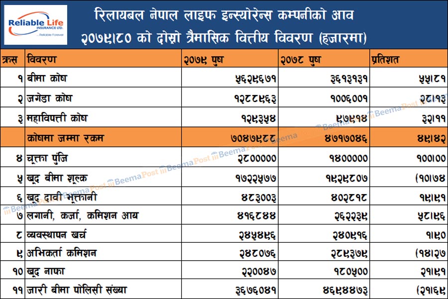 रिलायबल नेपाल लाइफको जीवन बीमा कोषमा ५ अर्ब ६२ करोड संचिती, नाफासहित अधिकांस सूचकमा देखियो सुधार