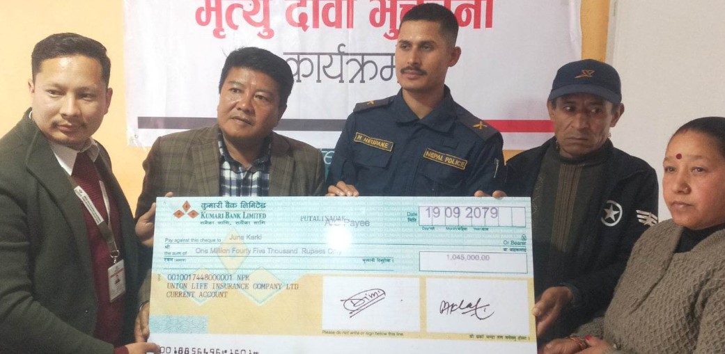 युनियन लाइफ इन्स्योरेन्स कम्पनीले बीमा दाबी भुक्तानी रकम हस्तान्तरण गरेको छ। कम्पनीको खाडीचौर शाखाले बिमित स्वर्गीय सम्झना कार्कीका परिवारलाई माघ २५ गते दश लाख ४५ हजार रुपियाँ मृत्यु दावी भूक्तानी प्रदान गरेको छ। सिन्धुपाल्चोकको भोटेकोशी गाउँपालिका–५ नयाँपुल निवासी स्वर्गीय...