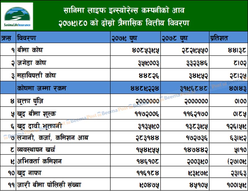 सानिमा लाइफको बीमा कोषमा ४ अर्ब रुपैयाँ संचिती, शतप्रतिशतले बढ्यो बीमा पोलिसी संख्या