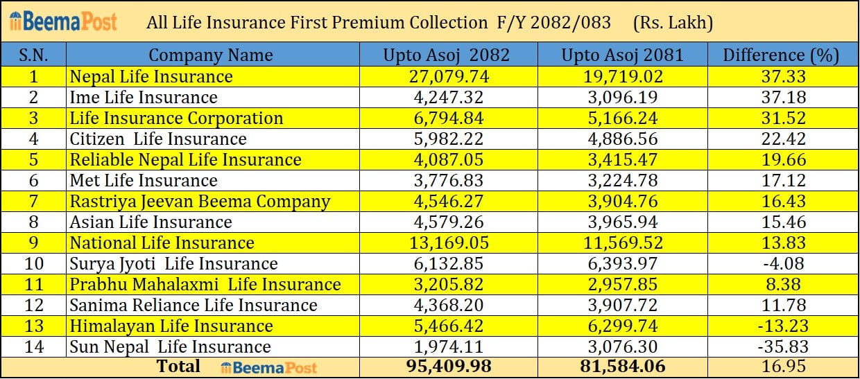 जीवन बीमकद्वारा नौ अर्ब ५४ करोड प्रथम बीमा शुल्क आर्जन, सर्वाधिक र बृद्धिदरमा नेपाल लाइफकै वर्चश्व