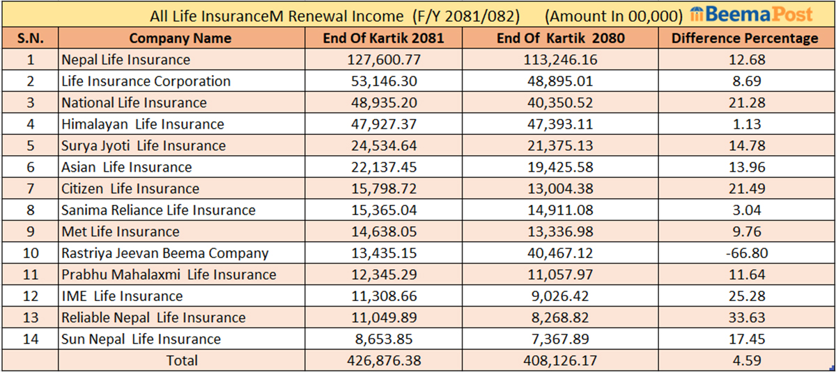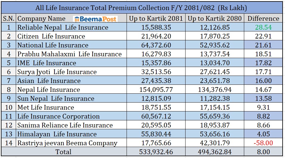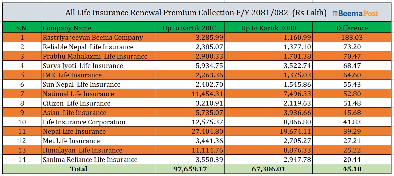 कात्तिक महिनामा जीवन बीमकको नविकरण बीमाशुल्क ४५ प्रतिशतले बढ्यो, राष्ट्रिय जीवन बीमा–रिलायबल र प्रभु महालक्ष्मीको सर्वाधिक बृद्धि