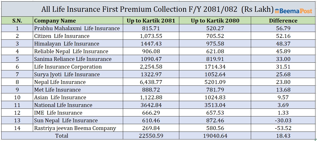 जीवन बीमकको नयाँ व्यवसायमा १८% को बृद्धि, अग्रस्थानमा नेपाल लाइफ, बृद्धिदरमा प्रभु महालक्ष्मी–सिटिजन र हिमालयनअघि