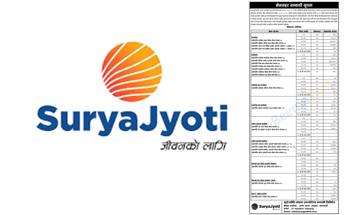 बोनसदर सार्वजनिक गर्ने पहिलो कम्पनी बन्यो सूर्यज्योति लाइफ, बीमितले अधिकतम् ९० रुपैयाँसम्म बोनस पाउने