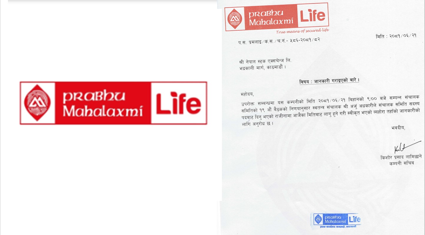 काठमाडौं । प्रभु महालक्ष्मी लाइफ इन्स्योरेन्सकी स्वतन्त्र सञ्चालक अन्जु अधिकारीले दिएको राजिनामा स्वीकृत भएको छ । कम्पनी सञ्चालक समितिको असोज २१ गते बिहान बसेको बैठकको निर्णयले स्वतन्त्र सञ्चालक अधिकारीको राजिनामा स्वीकृत गरेको हो ।