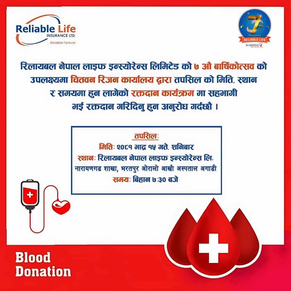 सातौं वार्षिकोत्सवमा रिलायबल नेपाल लाइफले रक्तदान गर्ने