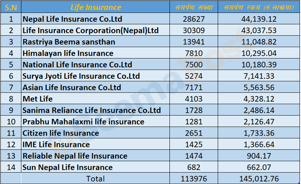 जीवन बीमा कम्पनीका १ लाख बीमितले गरे १४ अर्ब बढीको बीमा पोलिसी सरेण्डर, कुन कम्पनीका कति ? (सूची सहित )