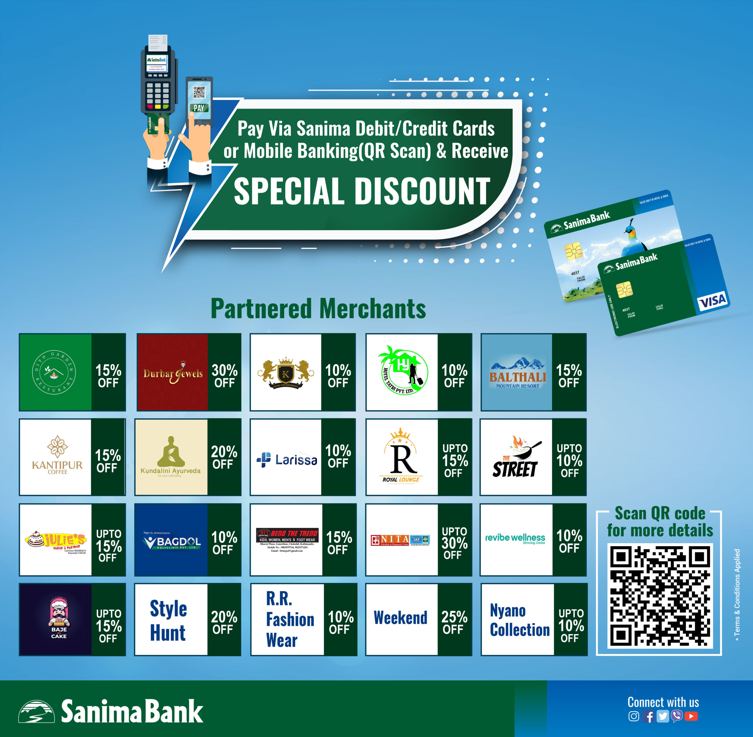 सानिमा बैंकको थप २० वटा मर्चेन्टहरुसंग छुटको व्यवस्था