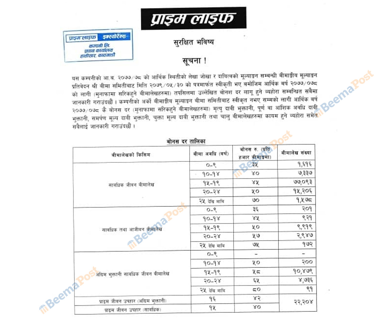 प्राइम लाइफको नयाँ बोनसदर बीमा समितिबाट स्वीकृत, बीमितले ८० रुपैयाँसम्म बोनस पाउने