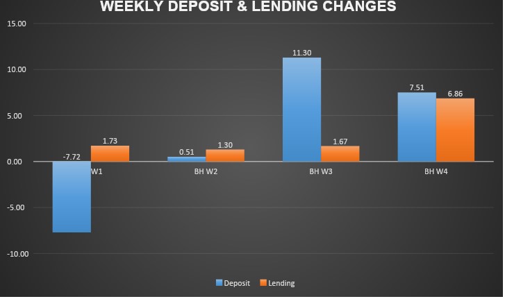 काठमाडौं । नेपाल बैंकर्स एसोसियसनमा अनुसार गत साता बैंकिंङ प्रणालीको निक्षेप बढेको छ। भदौ महिनाको १७ गतेसम्म बाणिज्य बैंकहरुको निक्षेप ४४ खर्ब ३७ अर्ब रहेकोमा भदौ २४ गतेसम्म बैंकहरुको निक्षेप ८ अर्बले बढेर ४४ खर्ब ४५ अर्ब कायम रहेको...