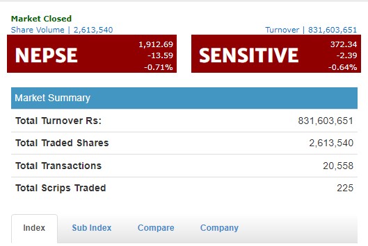 शेयरबजारको ओरालो यात्राः नेप्से १३ अंकले घट्दा हाइड्रोपावर सूचक सर्वाधिक खस्कियो