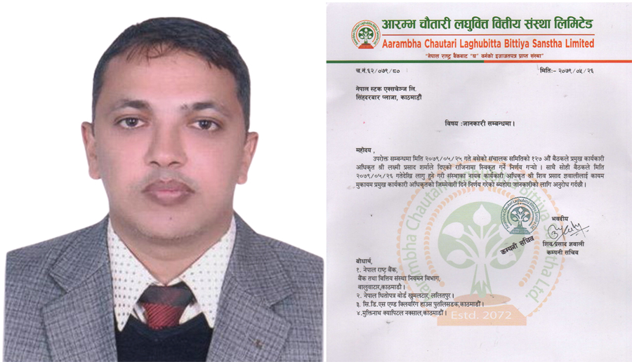 काठमाडौं । आरम्भ चौतारी लघुवित्त वित्तीय संस्था लिमिटेडको कायम मुकायम प्रमुख कार्यकारी अधिकृत (का.मु. सिइओ)को जिम्मेवारी शिव प्रसाद ज्ञवालीले पाएका छन् । यसअघि सिइओमा रहेका लक्ष्मी प्रसाद शर्माले सो पदबाट राजिनामा दिएकोमा कम्पनीको भदौ २५ गते बसेको संचालक समितिको...