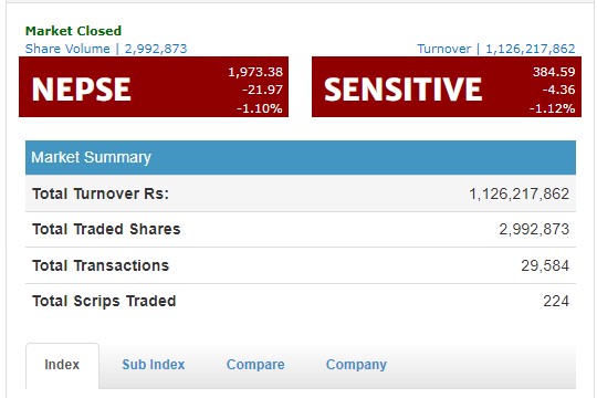 उतारचढावकाबीच शेयरबजारमा २१ अंकको गिरावट, हाइड्रोपावर र वित्त सूचक सर्वाधिक घट्दा कारोबार खुम्चियो