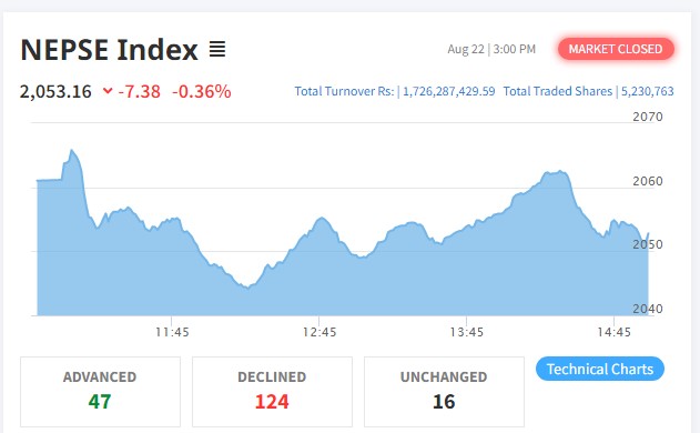 शेयरबजारको ओरालो यात्रा : नेप्से सूचक ७ अंकले घट्दा १२ उपसूचक राताम्य, कारोबार एक अर्बमाथि