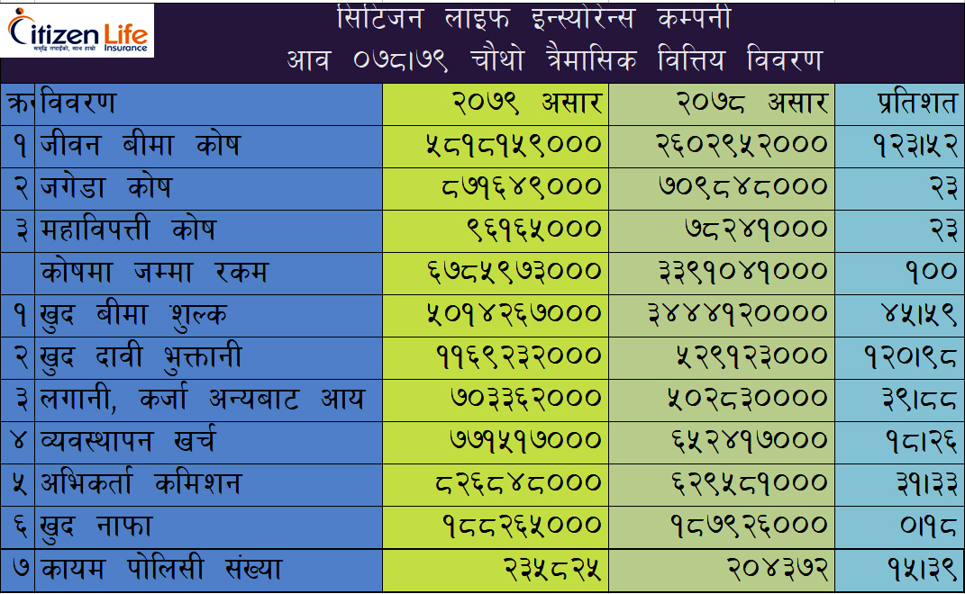 सिटिजन लाइफ इन्स्योरेन्सको खुद बीमाशुल्क आर्जन ४५ प्रतिशतले बढ्यो, जीवन बीमा कोष कति ?