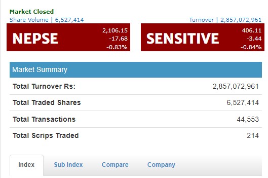 उतारचढावकाबीच दोहोरो अंकले घट्यो शेयरबजार, ११ सूचक राताम्य हुँदा कारोबार दुई अर्बमा सीमित