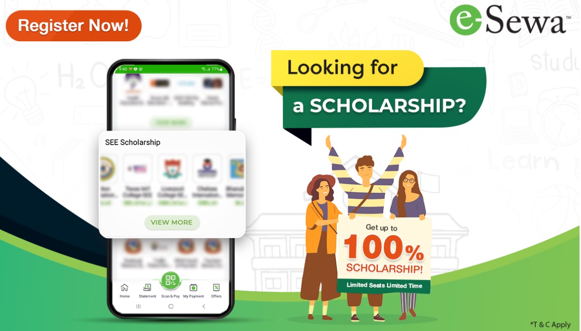 काठमाडौं । भुक्तानी सेवाप्रदायक कम्पनी इसेवाले एसइई परीक्षा उतीर्ण गरेका विद्यार्थीहरुलाई बम्पर अफर सार्वजनिक गरेको छ। यस अफर अन्तरगत एक हजार जना विद्यार्थीहरुले नेपालका विभिन्न कलेजमा शतप्रतिशत स्कोलरसिपमा अध्ययन गर्न पाउनेछन्। उक्त सेवाका लागि विद्यार्थीहरुले इसेवाको अकाउन्ट खोलेको हुनुपर्नेछ।...