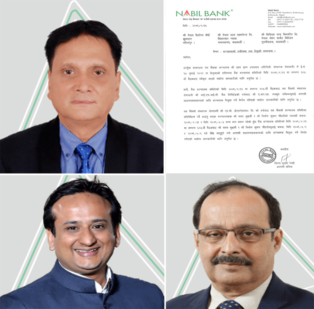 नबिल बैंकका संचालक उदय कृष्ण उपाध्यायद्धारा राजिनामा, मलय मुखर्जी र निर्वाण कुमार चौधरीको कार्यकाल थप