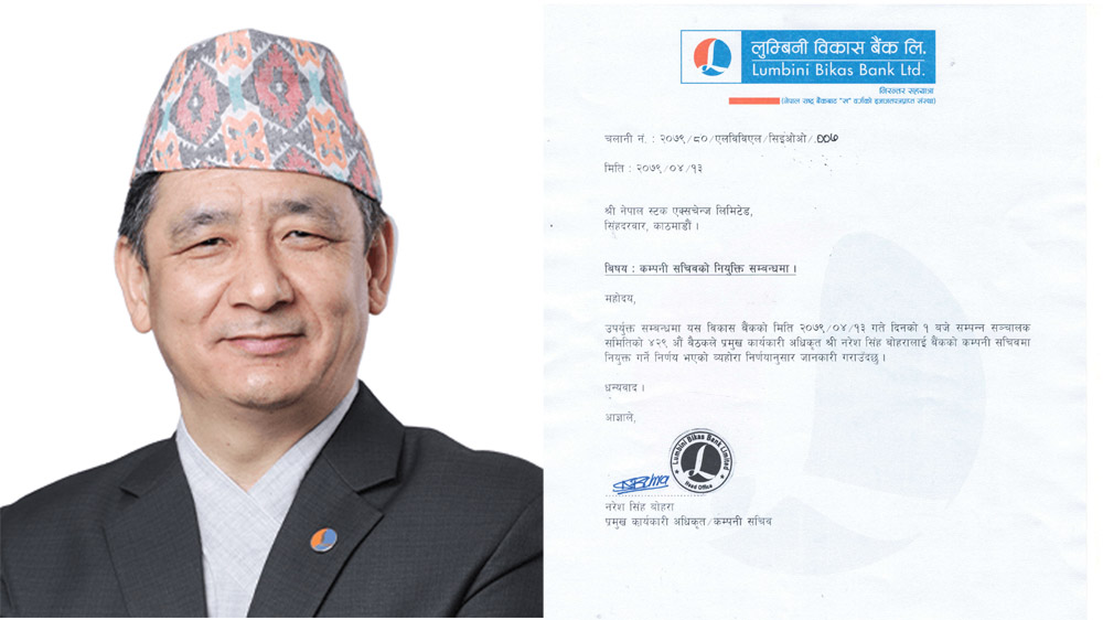 काठमाडौं । लुम्बिनी विकास बैंक लिमिटेडको कम्पनी सचिवमा नरेश सिंह बोहरा नियुक्त भएका छन् । कम्पनीको साउन १३ गते बसेको संचालक समितिको बैठकले बैंकका प्रमुख कार्यकारी अधिकृत (सिइओ) बोहरालाई कम्पनी सचिवको जिम्मेवारी दिने निर्णय गरेको हो ।