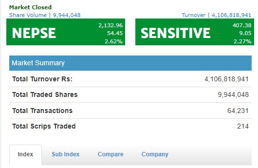 शेयरबजारमा चमत्कारिक बृद्धि: २१३२ को विन्दुमा उक्लियो नेप्से, फाइनान्स सूचक चम्किदा ४ अर्बमाथिको कारोबार