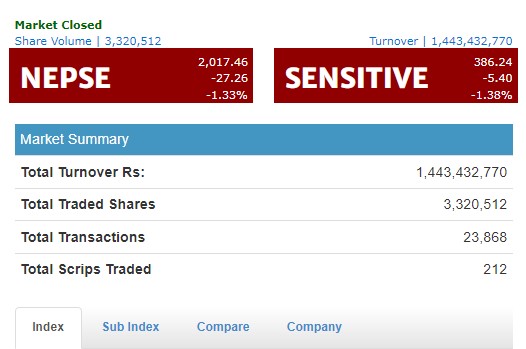 २७ अंकले घट्यो नेप्से, सबै सूचक राताम्य हुँदा कारोबार डेढ अर्बमा सीमित