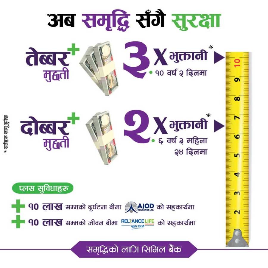 सिभिल बैंकले ल्यायो दोब्बर र तेब्बर प्लस मुद्दती योजना, २० लाख रुपैयाँसम्मको बीमा सुविधा
