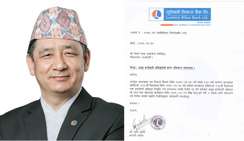 काठमाडौं । लुम्बिनी विकास बैंक लिमिटेडको प्रमुख कार्यकारी अधिकृत (सिइओ)मा नरेश सिंह बोहरालाई पुनः नियुक्त गरिएको छ । कम्पनीको असार ३० गते बसेको संचालक समितिको बैठकले असार २८ गतेको बैठकबाट सिइओमा बिजयबहादुर श्रेष्ठलाई नियुक्त गरिएको निर्णयलाई खारेज गरि उक्त...