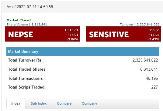 आर्थिक संकटकाबीच शेयरबजारमा भारि गिरावट, नेप्से ७७ अंकले घट्दा सबै सूचक राताम्य