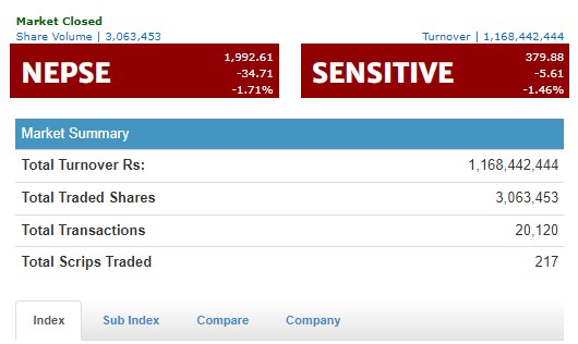शेयरबजारको ओरालो यात्रा: नेप्से ३४ अंकले घटेर १९९२ को विन्दुमा, सबै सूचक राताम्य