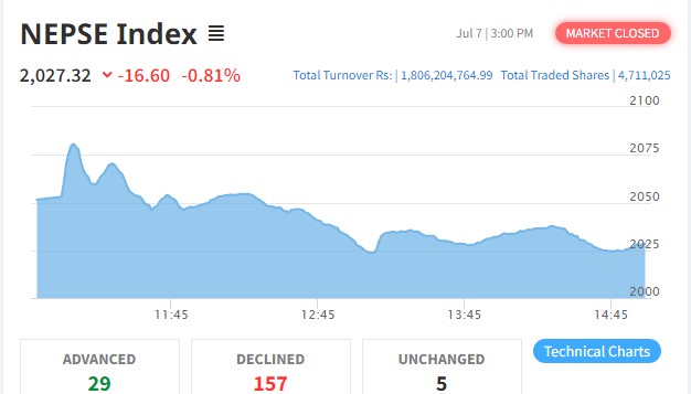आर्थिक संकटकाबीच १६ अंकले घट्यो शेयरबजार, १२ सूचक राताम्य हुँदा कारोबार खुम्चियो