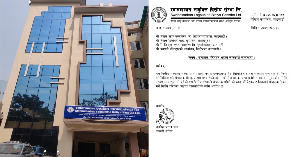काठमाडौं । स्वावलम्बन लघुवित्त वित्तीय संस्था लिमिटेडको संचालकमा मेख बहादुर थापा नियुक्त भएका छन् । यसअघि संस्थाको संचालक समितिमा संस्थापक शेयरधनी नेपाल इन्भेष्टमेन्ट बैंकका तर्फबाट प्रतिनिधित्व गर्दै आएका सुरज राम भण्डारीको सट्टामा थापा मनोनित भई आएका थिए । कम्पनीको...