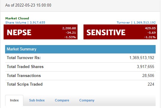 २२ सय विन्दुुमा झर्यो नेप्से इन्डेक्स, शेयरबजार ३४ अंकले घट्दा १३ उपसूचक नै राताम्य
