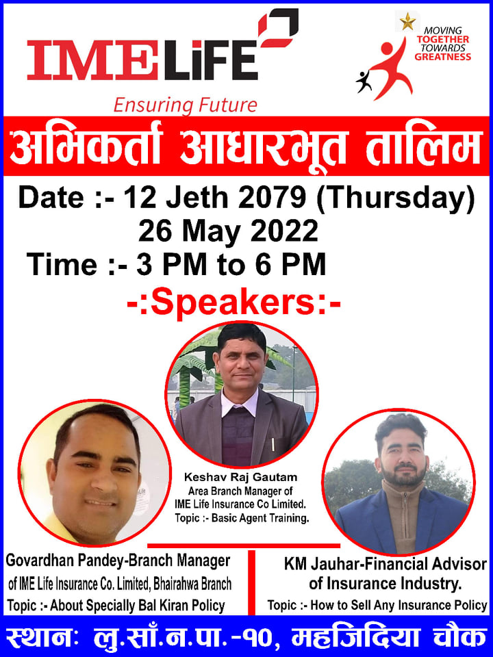 आइएमई लाइफको एक दिने अभिकर्ता आधारभूत तालिम जेठ १२ गते हुँदै