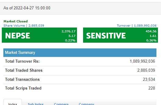 काठमाडौं । अघिल्लो दिन १५ अंकले घटेको पुँजीबजार आज सामान्य बृद्धि भएको छ । देशमा आर्थिक संकट बढेसँगै शेयरबजारमा समेत प्रभाव देखिएकोले निरन्तर घटिरहेको छ । आज नेप्सेमा सूचीकृत २२८ कम्पनीको २८ लाख ८५ हजार ३९ कित्ता शेयर किनबेच...