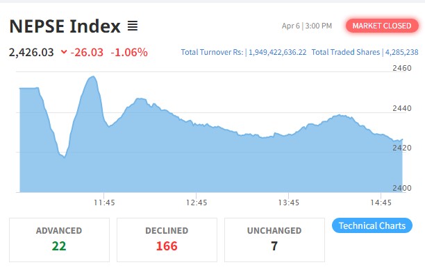 आर्थिक संकटकाबीच २६ अंकले घट्यो शेयरबजार, कारोबार करिब २ अर्बमा सीमित