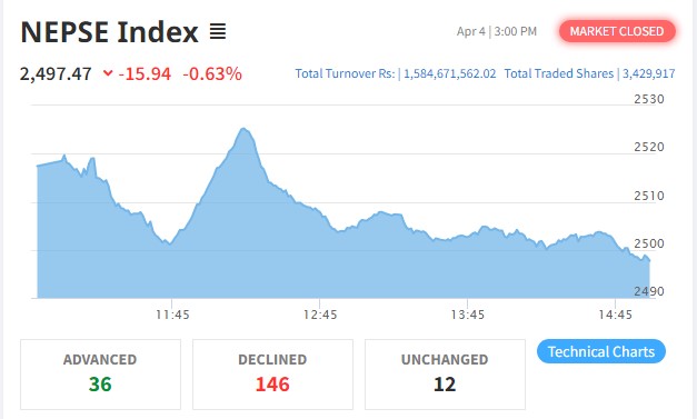 काठमाडौं । साताको दोस्रो दिन नेप्से परिसूचक दोहोरो अंकले घटेको छ । चरम आर्थिक संकट र तरलता संकट व्यवस्थापन हुन नसक्दा पछिल्लो समय शेयरबजारमा लगतार गिरावट आइरहेको छ । आज नेप्से परिसूचक १५.९४ अंकले कारोबार समेत खुम्चिन पुगेको छ...