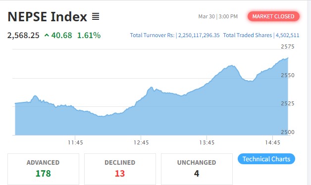 शेयरबजारमा हरियाली : ४० अंकले नेप्से बढ्दा २ अर्बमाथि कारोबार, बीमा समूह चम्कियो