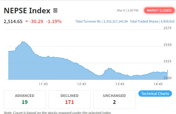 काठमाडौं । साताको चौथौ दिन शेयर बजार ३० दशमलव २९ अंकले घट्दा २५१४ दशमलव ६५ को विन्दुमा कायम भएको छ। २२९ नेप्सेमा सूचीकृत कम्पनीको ४९ लाख ५९ हजार ९ सय १९ कित्ता शेयर खरिदबिक्रि हुदाँ २ अर्ब ३५ करोड...