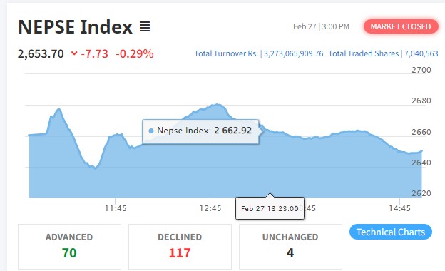 काठमाडौं । साताको पहिलो दिन आइतबार शेयरबजारमा झिनो गिरावट आएको । गत साताको कारोबारको अन्तिम दिन ५८ अंकले घटेर बजार बन्द भएको थियो । आज नेप्से परिसूचक ७.७३ अंकले घटेर २६५३.७० विन्दुमा झरेको छ । नेप्सेमा सूचीकृत २२४ कम्पनीको...