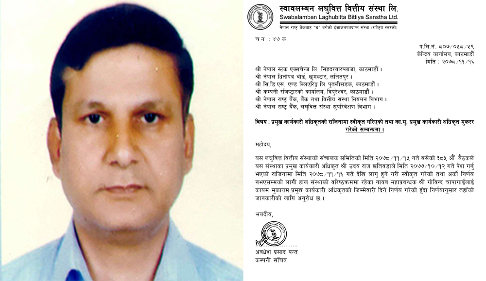 स्वावलम्बन लघुवित्तका सिइओ उदय राज खतिवडाले दिए राजिनामा, का.मु सिइओको जिम्मेवारी चापागाईँलाई