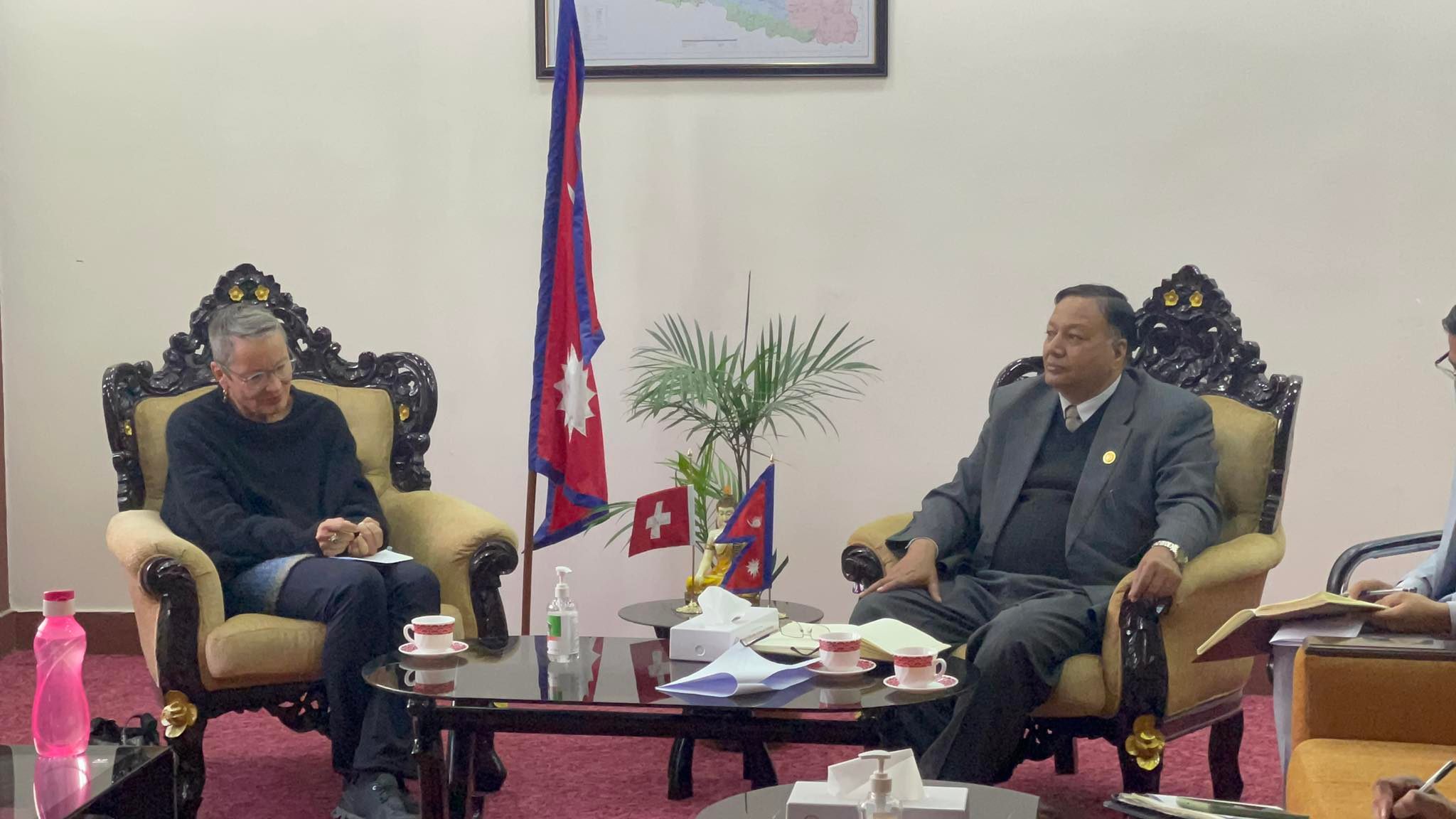 शिक्षामन्त्री पौडेल र स्वीस राजदूत क्यापलरसँग शिष्टाचार भेटवार्ता