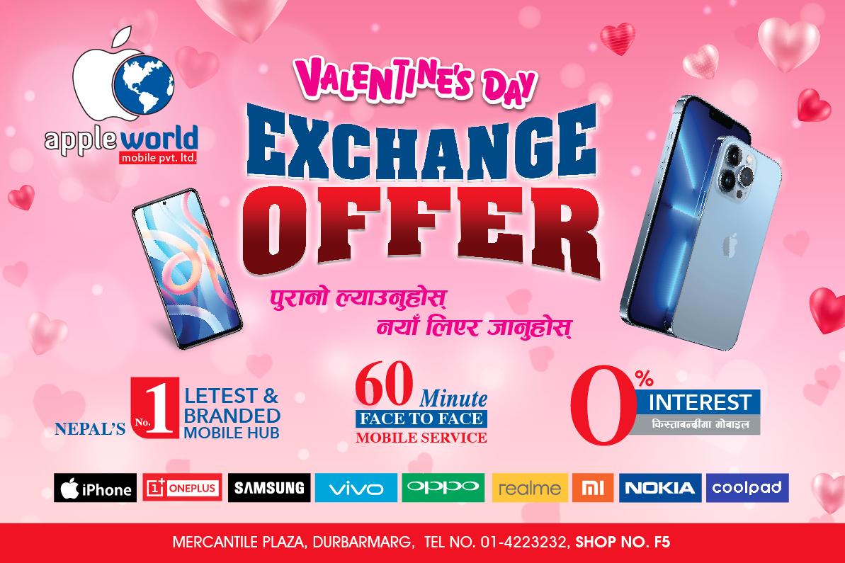 एप्पल वर्ल्ड मोबाइलको भ्यालेन्टाइन डे मा एक्सचेञ्ज अफर, ६० मिनेट फेस टू फेस सर्भिस