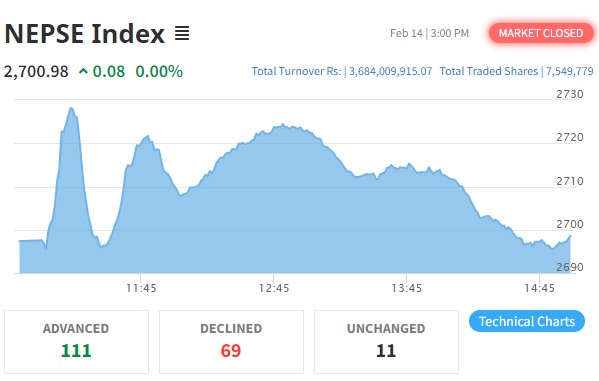 काठमाडौं । आईतबार ब्याजदर वृद्धिको प्रभावको १ सय अंकले घटेको शेयर बजारमा आज झिनो अंकले सुधार देखिएकोछ । नेप्से आज ०।०० अंकले वृद्धि भएर २७००। ९८ को विन्दुमा कायम भएको छ । २२७ कम्पनीको ७५ लाख ४९ हजार ७७९...