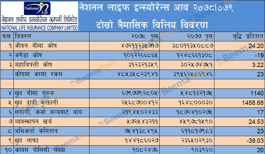 दोस्रो त्रैमासमा नेशनल लाइफ इन्स्योरेन्सको प्रगति, झण्डै आधा खर्बको जीवन बीमा कोष, २४% ले बढ्यो बीमा शुल्क