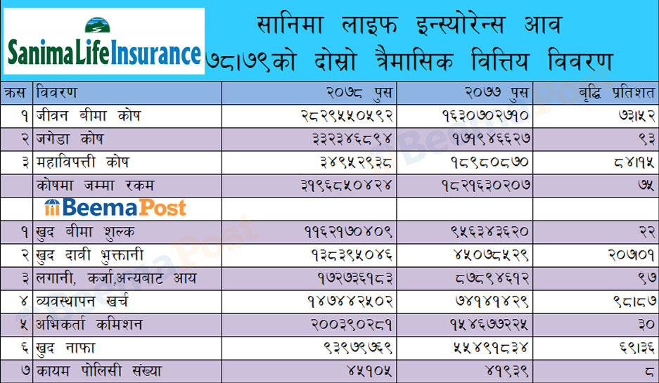 दोस्रो त्रैमासमा सानिमा लाइफको प्रगति, झण्डै तीन अर्बको जीवन बीमा कोष, खुद बीमा शुल्क आम्दानी २२% ले बृद्धि