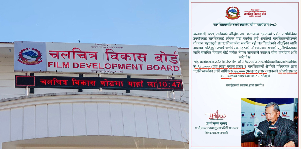 काठमाडौं । सरकारले नेपाली चलचित्र क्षेत्रको दिगो विकास र चलचित्रकर्मीहरुको सुरक्षालाई मध्यनजर गर्दै स्वास्थ्य बीमा कार्यक्रम अघि बढाएको छ । नेपाली कलाकर्मी, स्रस्टा, सर्जकहरुको नियामक निकाय चलचित्र विकास बोर्डमार्फत नेपाल सरकारले ‘चलचित्रकर्मीहरुको स्वास्थ्य बीमा कार्यक्रम, २०८२’ अघि सारेको हो...
