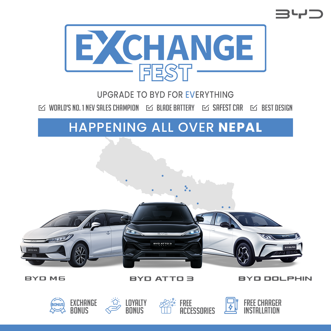 पुराना गाडीसँग बीवाईडीको ब्रान्ड न्यू ईभी साट्न सकिने, माघ ९ देखी देशभर ‘एक्सचेन्च फेस्ट’ हुँदै