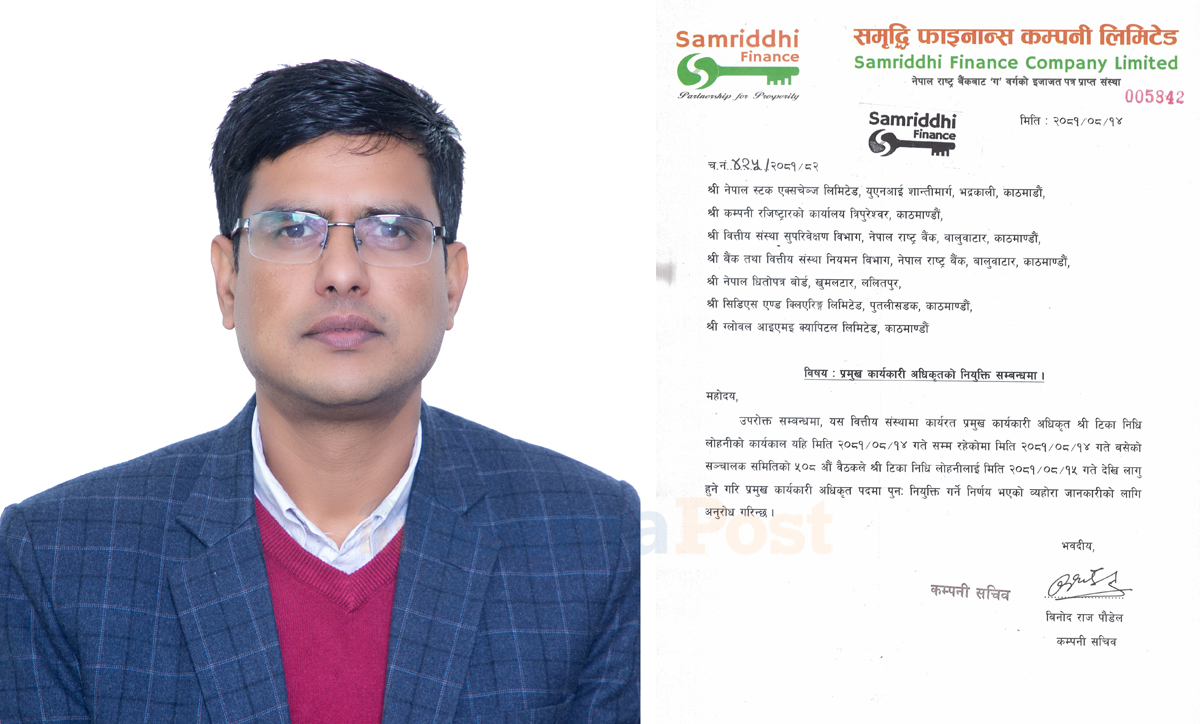 काठमाडौँ । समृद्धि फाइनान्स कम्पनी लिमिटेडको प्रमुख कार्यकारी अधिकृतमा टिका निधि लोहनी नियुक्त भएका छन् । कम्पनी सञ्चालक समितिको मंसिर १४ गते बसेको बैठकको निर्णयले निधिलाई कार्यकारी अधिकृतमा पुःन नियुक्त गर्ने निर्णय गरेको हो ।