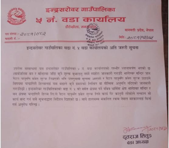 चन्द्रागिरी हिल्सले उठाउँदै आएको प्रवेश शुल्क तत्काल बन्द गर्न इन्द्रसरोवर गाउँपालिकाको निर्देशन